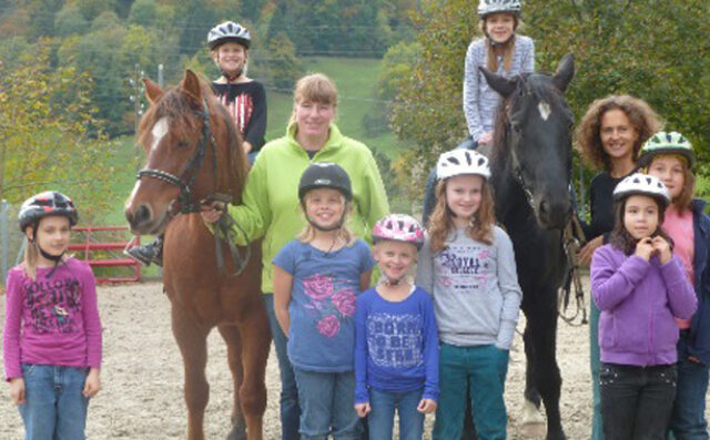 Wir putzen unsere zwei Pferde und laufen a. d. Reitplatz im Ort (geführt) ; danach kannst Du deine Geschenke auspacken! Anschliessend wartet ein Pferdequiz und unser Hufeisenzielwurf auf Euch. Bei der Zusatzstunde könnt Ihr im Stall Kälbchen füttern und den Kühen beim Melken zuschauen. Ab 6 Jahren.
