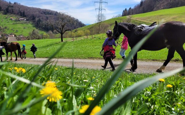 Horsliweg - wir sind unterwegs mit unseren zwei Pferden, bepackt, Kinder können abwechselnd reiten und führen, unterwegs warten noch pferdige Aufgaben auf Euch :-) Dauer 3 Stunden